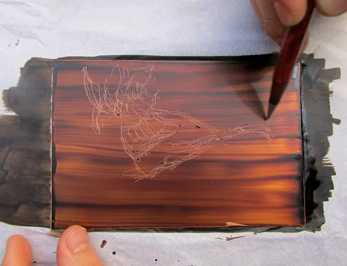 A técnica envolve a aplicação de um verniz ou resina à placa de metal, que é então desenhado com uma ponta de metal ou outra ferramenta de gravação. Quando a placa é submersa em uma solução ácida, o ácido corroerá as áreas da placa que não foram cobertas pelo verniz, deixando a imagem esculpida em baixo-relevo. A placa é então entintada e impressa em papel.