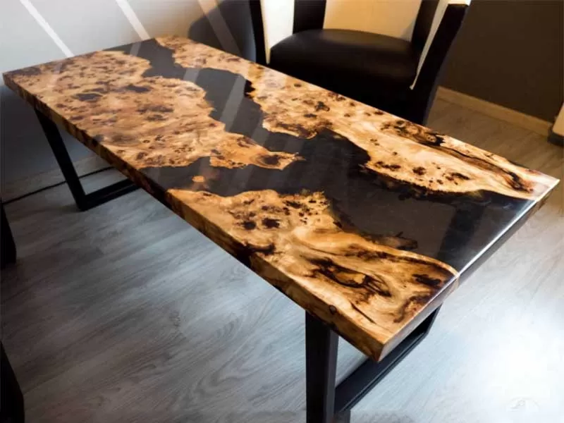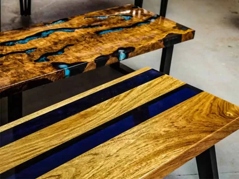 Mesas, bancadas e outros itens de mobiliário podem ser criados com resina, muitas vezes incorporando madeira, pedras e outros materiais. A resina é um material resistente e versátil, é possível criar uma grande variedade de cores e efeitos mesclando a resina com outros materiais.